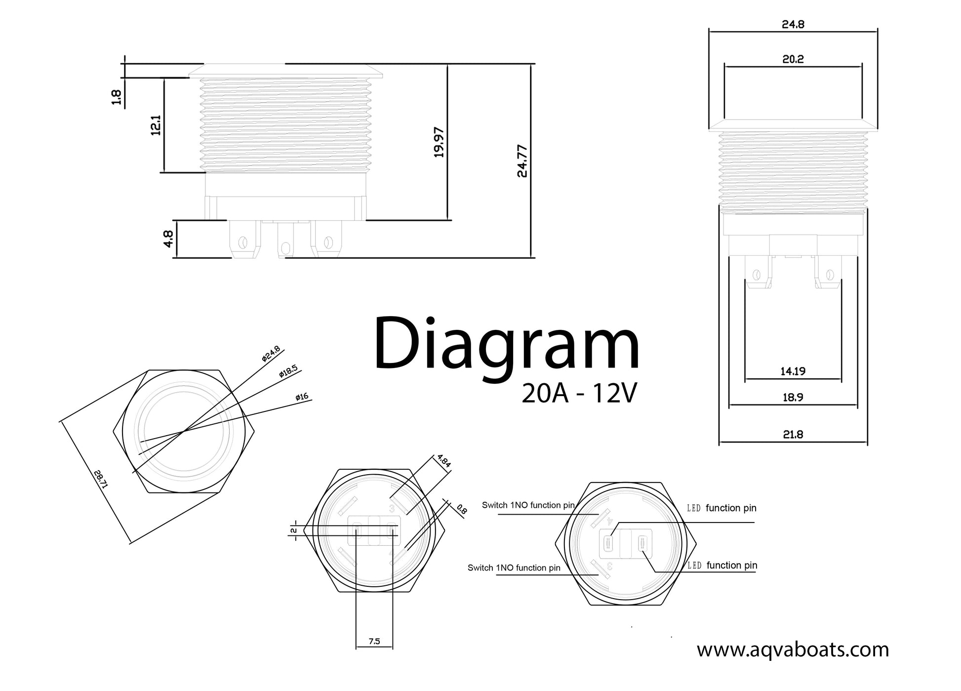 Interrupteurs à bouton-poussoir en acier inoxydable SS316, 12 V-24 V 20 A - Fonction étanche (marche/arrêt) avec LED - Câble de connexion IP67 inclus